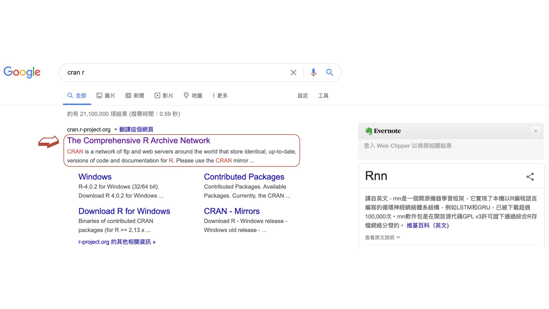 - 在 Google 搜尋「Cran R」(大小寫皆可),點選第一個連結