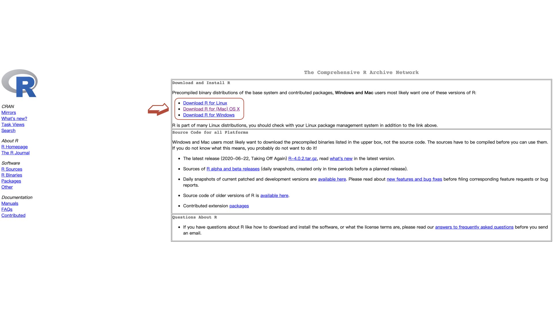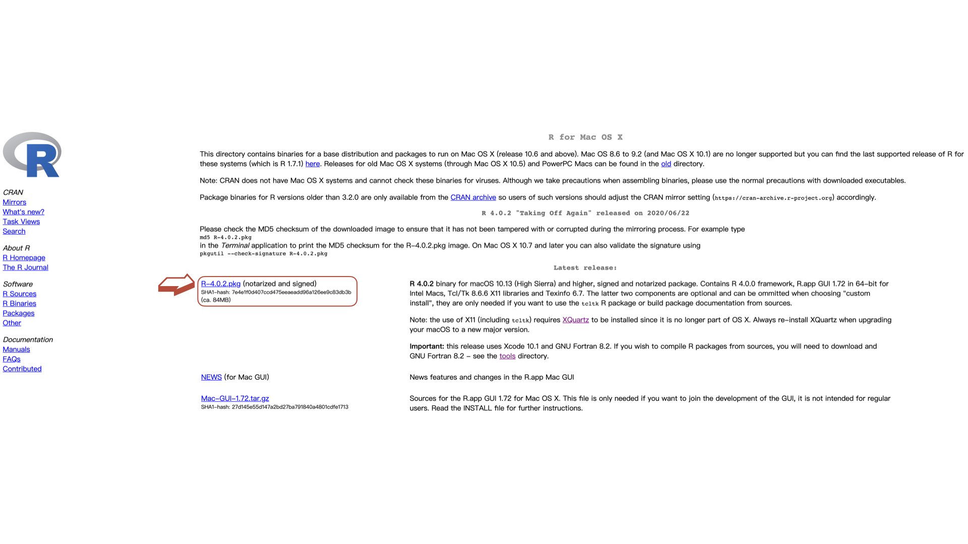 - 以二煎拌的 iMac 為例,點 Mac 版本進來,基本上可以滑到最下面選「base」再到裡面選較新的版本,後來發現在點進來後這頁的 Latest release 就可以選「R-4.0.2.pkg」下載安裝了