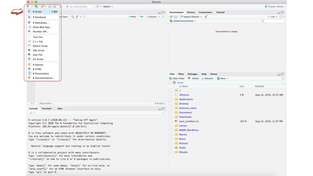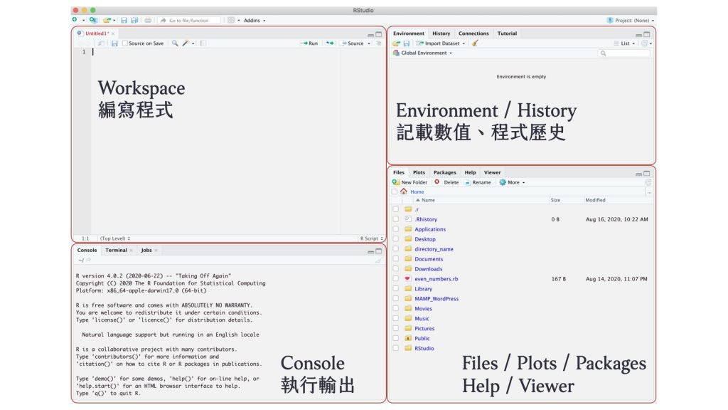 .Files / Plots / Packages / Help / Viewer [右下角] 檔案(Files)讓我們知道 R 語言所在的工作目錄(Working Directory)、圖形(Plots)則能瀏覽我們畫好的圖形、套件(Packages)紀錄已安裝的套件與載入現況、查詢(Help)能夠檢視我們在 Console 查詢的文件、以及預覽器(Viewer)是預覽網頁的輸出結果及 html file