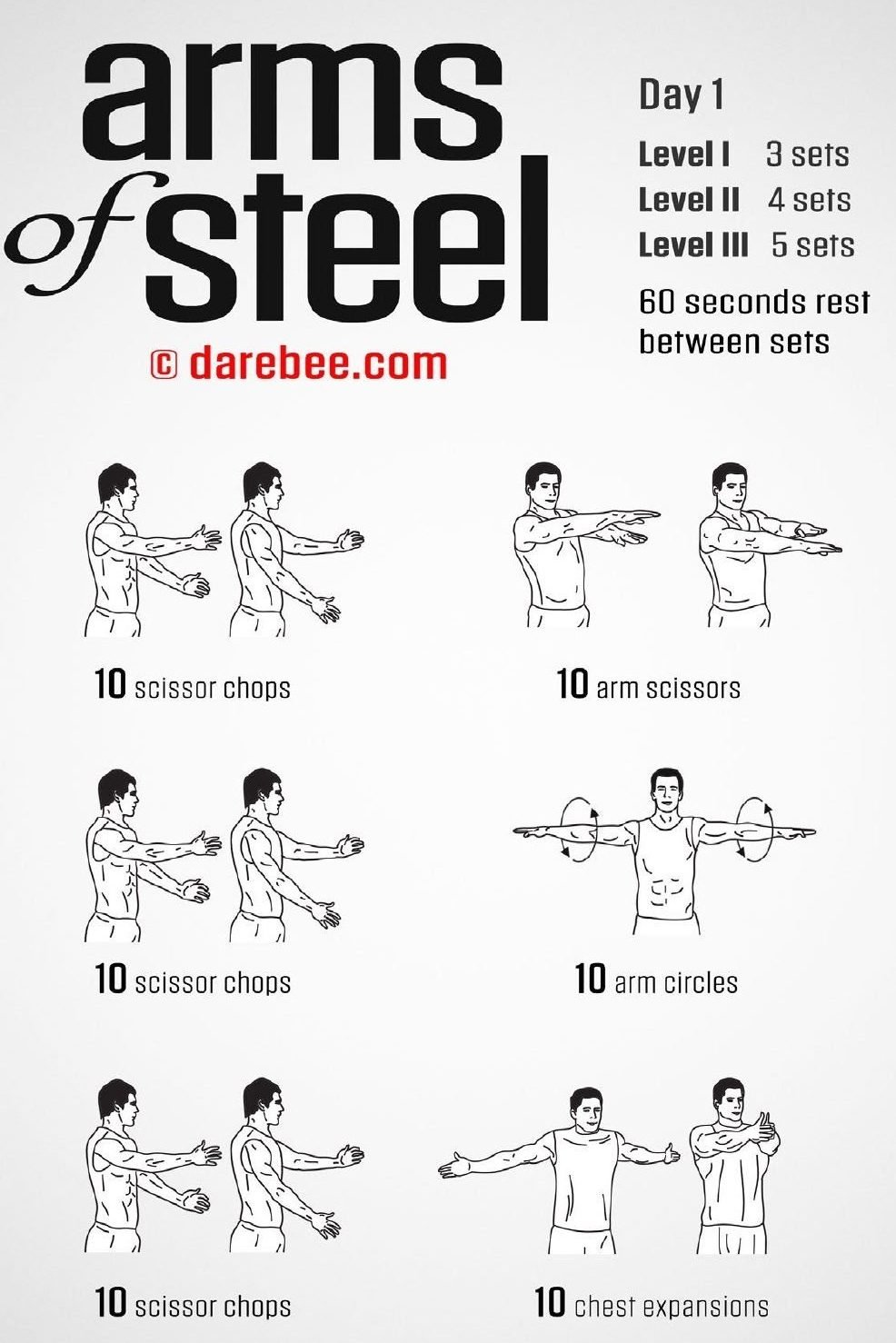 圖一:剪刀砍柴 10 次、手臂剪刀 10 次、剪刀砍柴 10 次、手臂畫圈 10 次、剪刀砍柴 10 次、擴胸 10 次